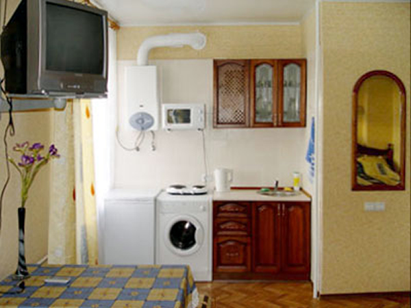 Dnepropetrovsk Ukriane country style studio apartment in the city center on Moskovskaya Street. Located between Karl Marks and the Dneper River, close to shops restaurants, cafes and an affiliate office. New country furnishing add a fresh look to this bright and sunny space. Apartment has a queen size bed and sleeper sofa. Windows are new sound proof to insure a quite nights sleep. There is a completely equipped kitchenette with water filters for in-house cooking. The bath and kitchenette have self-contained hot water system. Entrance is from the courtyard with code lock security doors. Amenities include Cable TVw/remote, microwave, and washing machine.